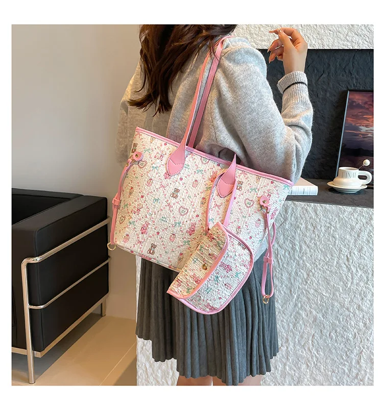 Lady’s Large Capacity Cartoon Print Woman’s Tote Bags Women’s Handbag with Wallet for Summer Shopping – Pink